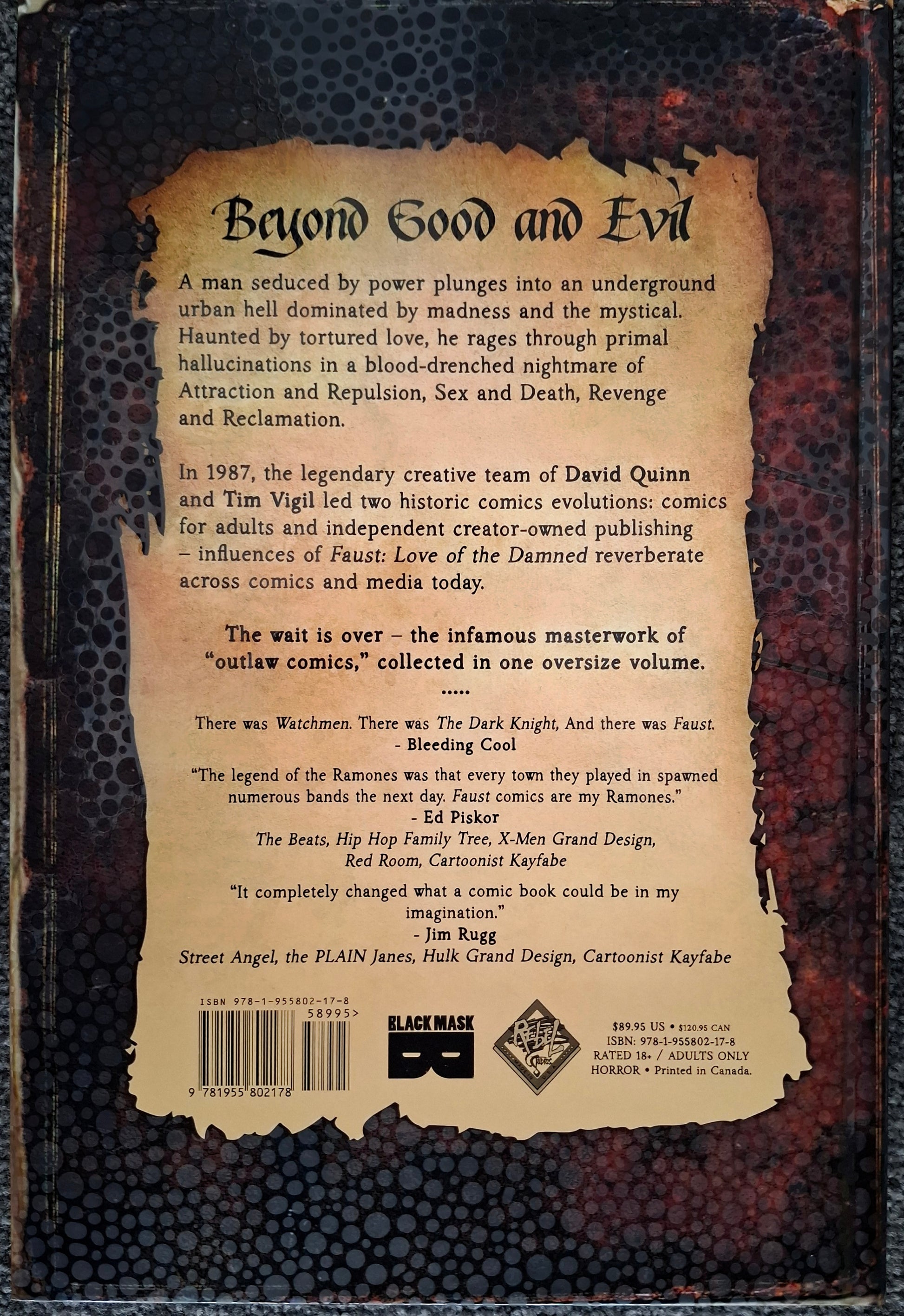 Dive into a legendary journey of darkness and desire with this oversized hardcover edition of Faust: Love of the Damned — a bold and unforgettable graphic novel that helped shape the “adult horror comics” genre. Crafted by visionary creators David Quinn (writer) and Tim Vigil (artist), this definitive collection brings together the complete Faust saga in one epic volume.