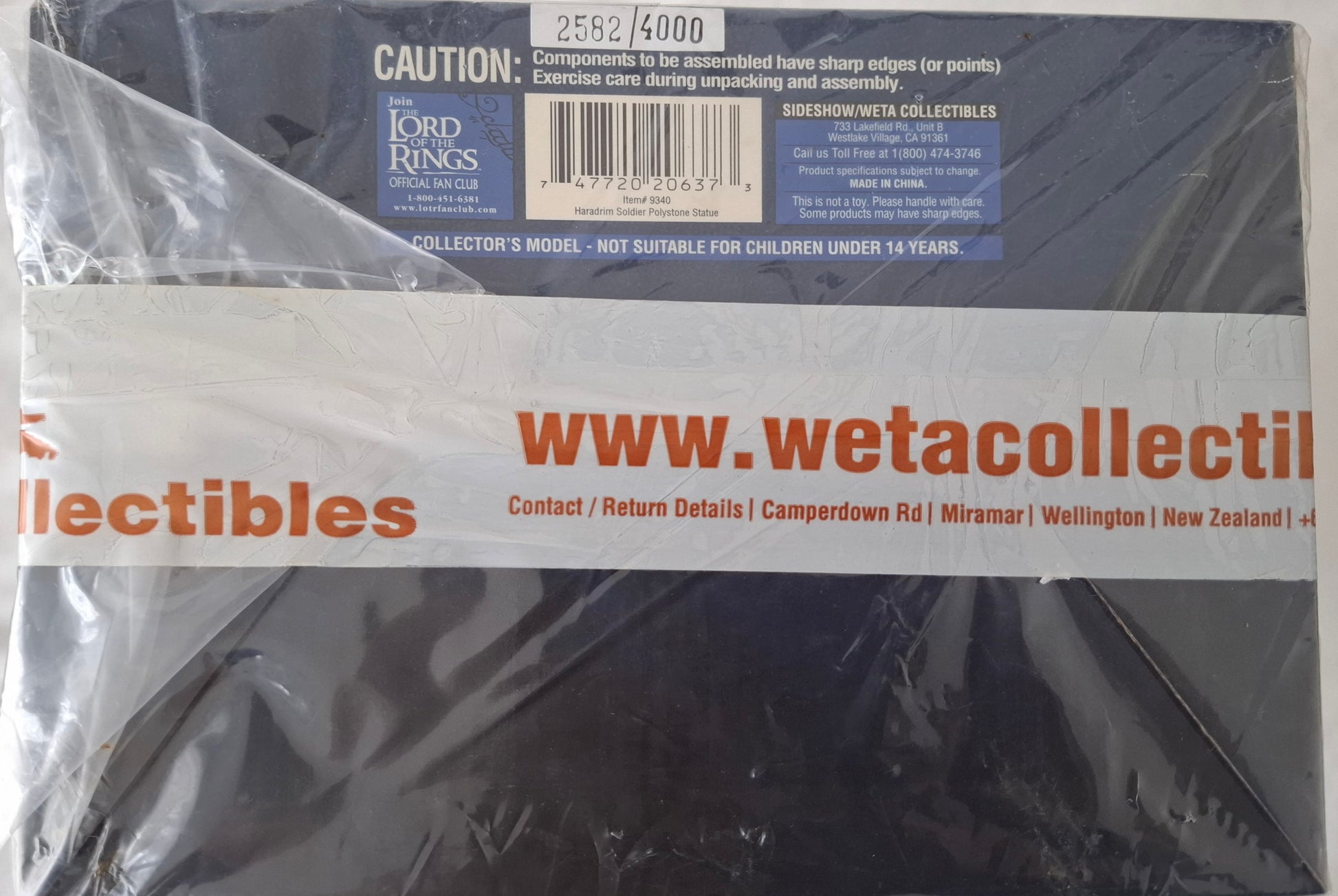 The Sideshow Weta Collectibles New Line Cinema The Lord of the Rings The Return of the King HARADRIM SOLDIER Polystone statue sculpted by Michael Asquith is a limited edition figurine. Produced by WETA Limited in 2004. With only 4000 pieces made, this being #2582, this collectible item is a rare find for fans of The Lord Of The Rings and collectors of unique figurines. A must-have for any avid enthusiast this statue is a valuable addition to any collection.