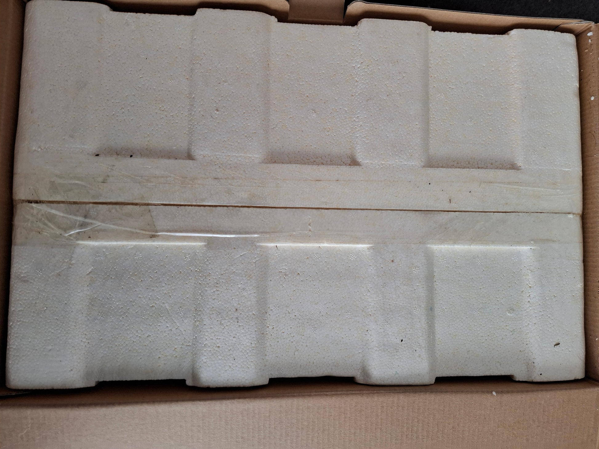 The internal polystyrene and factory tape are still intact. This has never been out of its box. There is some slight discolouration to the polystyrene.