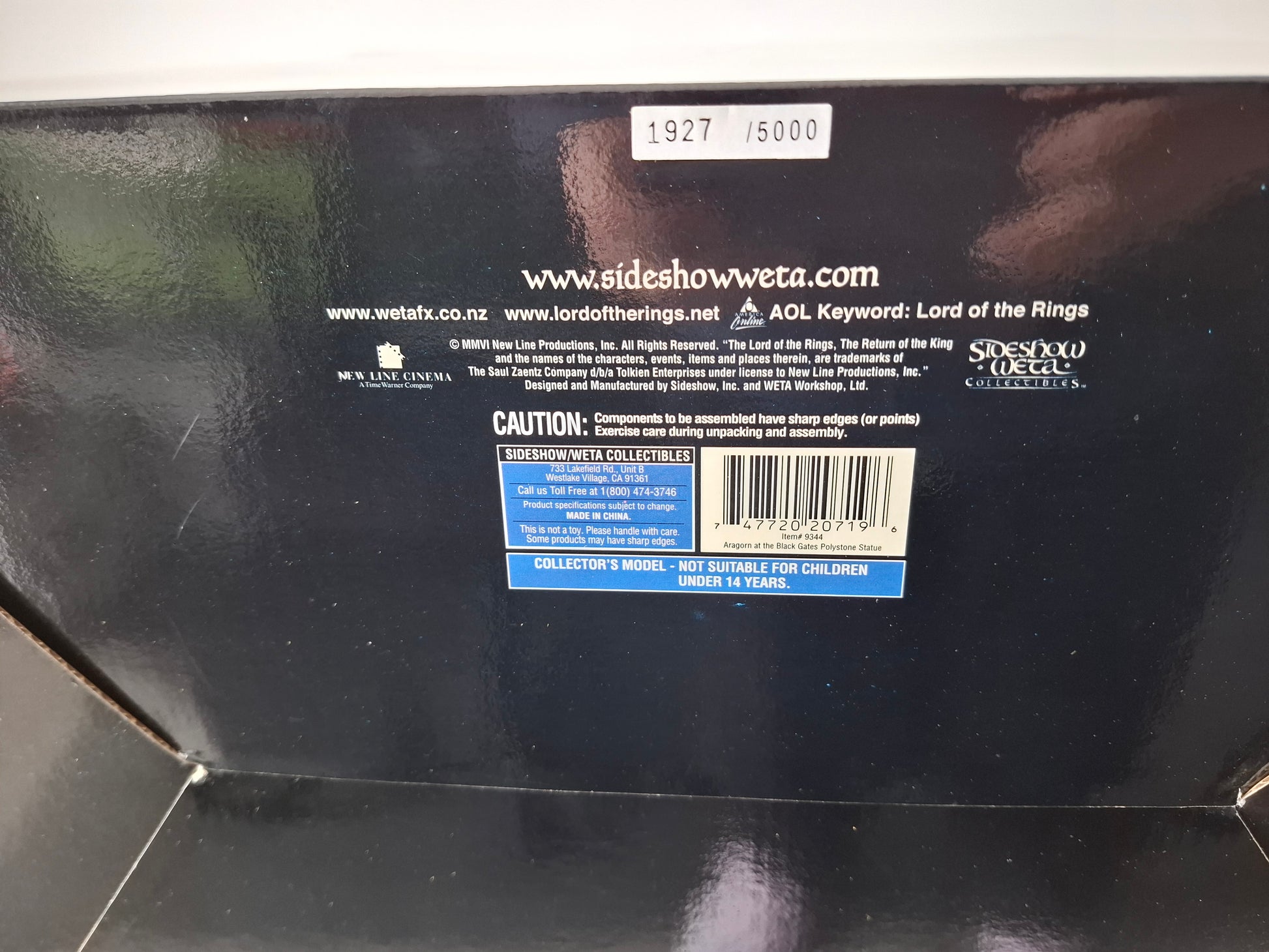 The Sideshow Weta Collectibles New Line Cinema The Lord of the Rings The Return of the King ARAGON AT THE BLACK GATES Polystone statue sculpted by Brigitte Wuest is a limited edition figurine. Produced by WETA Limited in 2004, this intricately detailed statue captures the essence of the Aragon in full flight amidst his steed Brego in stunning detail. With only 5000 pieces made, this being #1927, this collectible item is a rare find for fans of The Lord Of The Rings and collectors of unique figurines. A must-have for any avid enthusiast this statue is a valuable addition to any collection.
